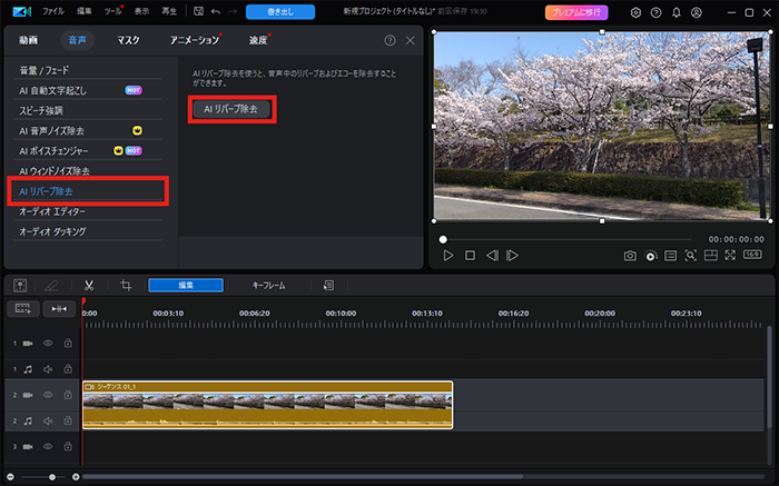 - 「音声」タブを選択して「リバーブ除去」を選びます。